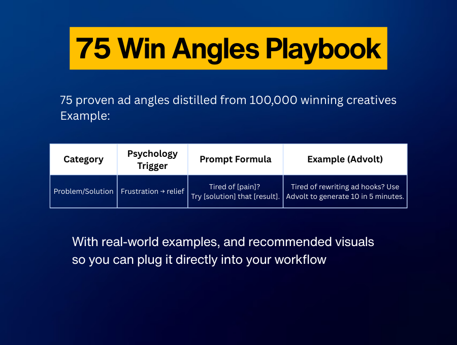 Built from 100,000+ winning Meta ads, this playbook gives you 75 proven angles with psychology triggers, formulas, and real examples