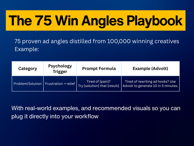 Advolt Kit gives you everything to launch and scale winning ads fast, 1000+ plug-and-play ad templates, 75 proven angles, 150 viral hooks, AI Copy bot trained on 100,000 ads, and mini video trainings, so you can ship 30+ high-converting ads in 7 days.